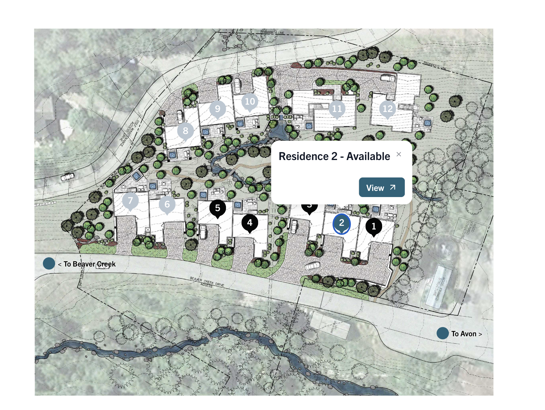 Next step, the primary point of public contact with the brand, a website with a suite of integrated programs that kept the project fully synced with company systems including integrations from our design program, and CRM system. With these self-updating integrations the site was able to seamlessly keep itself up to date as we navigated several flurries of public interest in the project. One interesting feature of note for the site was the application of an interactive sitemap that showed available residence and their location on the site, generating sales-driving interest in the properties that remained available.